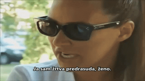 Ana Nikolic, wearing sunglasses, states she is a victim of prejudice.