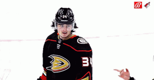 Anaheim Ducks player Jamie Drysdale stands on the ice, wearing his number 34 jersey.