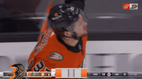 Mason McTavish celebrates a goal for the Anaheim Ducks in an NHL hockey game.