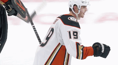 Anaheim Ducks players Troy Terry and Trevor Zegras share a secret handshake on the ice.
