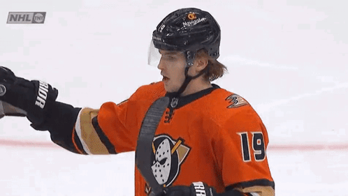 Anaheim Ducks player Troy Terry on the ice during a hockey game, wearing his number 19 jersey.
