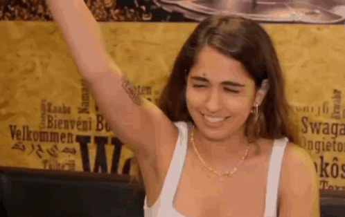 Anaju, from Operacion Triunfo, laughs joyfully, raising her arm with a tattoo and covering her face.