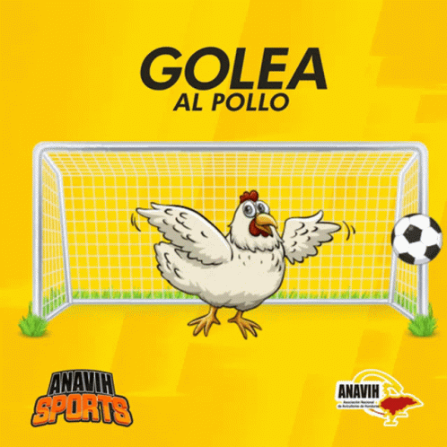 ANAVIH ad featuring a cartoon chicken playing soccer with a ball in front of a goal, promoting 'Golea al Pollo'.