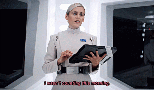 Dedra Meero, played by Denise Gough, holds a tablet and delivers the line 'I wasn't counting this morning' in Andor.