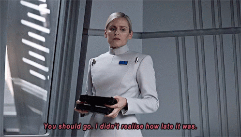 Dedra Meero from Andor, portrayed by Denise Gough, tells someone they should go, realizing how late it is.