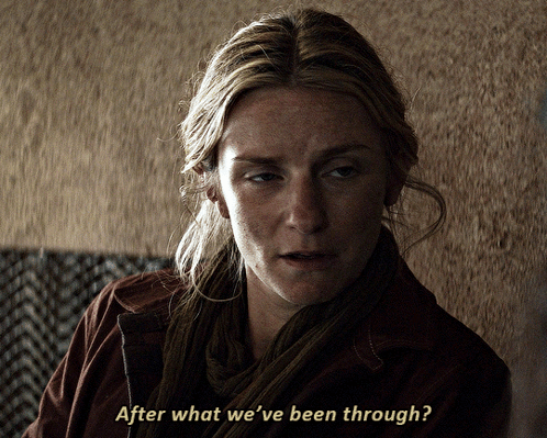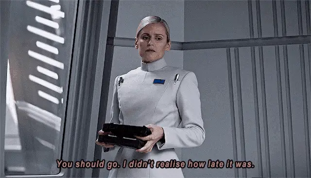 Faye Marsay as Vel Sartha from Andor, asking 'After what we've been through?' with a serious expression.