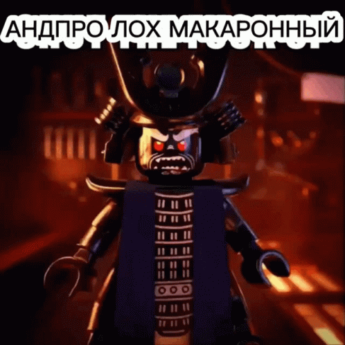 A Lego samurai robot with glowing red eyes and the Russian text 'АНДПРО ЛОХ МАКАРОННЫЙ' (ANDPRO LOCH MACARONI).