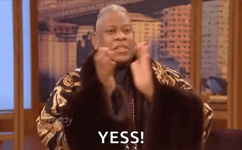 Andre Leon Talley enthusiastically exclaims 'YESS!' while clapping, wearing a distinctive fur-trimmed coat.