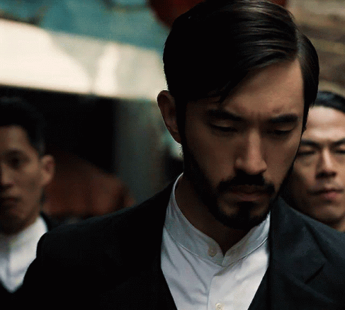 Andrew Koji as Ah Sahm, looking intense with a beard and slicked-back hair, wearing a suit and white shirt.