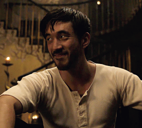 Andrew Koji as Ah Sahm from Warrior on HBO Max, smiling with a beard and wearing a light henley shirt.