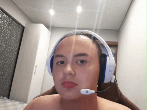 Andrey Popov, shirtless, wearing white headphones with a microphone in a room.