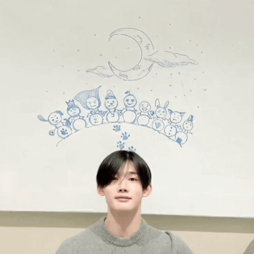 Andteam Jo smiles while making a heart gesture in front of a whiteboard drawing of snowmen and a crescent moon.