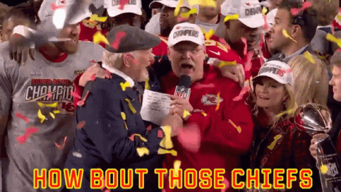 Andy Reid celebrates with the Kansas City Chiefs after their Super Bowl victory, surrounded by confetti.