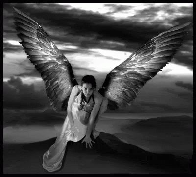 A woman with large, feathered angel wings sits on a rocky hill against a dramatic, cloudy sky in this black and white image.