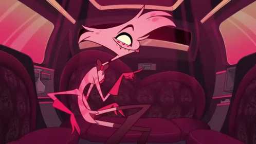 Angel Dust, the animated character, reacts with surprise and points while sitting in a luxurious car interior.