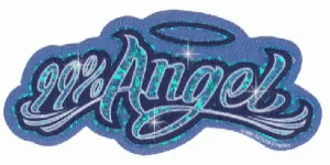A close-up shot of a white sticker featuring the text '99% ANGEL' in black, adorned with a yellow halo.