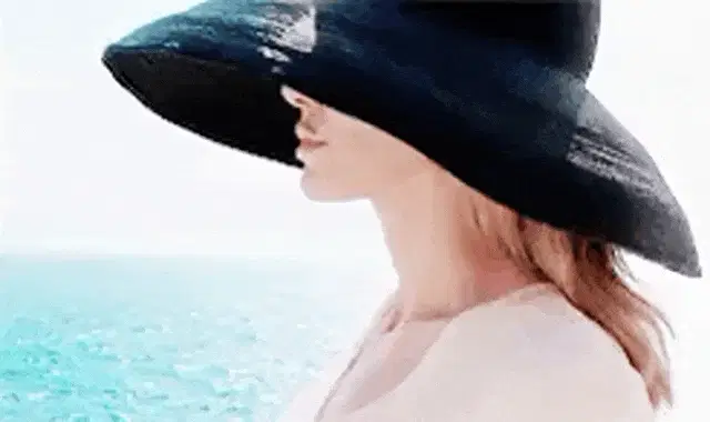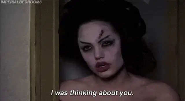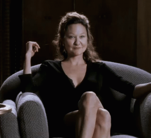 Angelina, a woman with curly brown hair, relaxing in a grey armchair, wearing a black v-neck top.