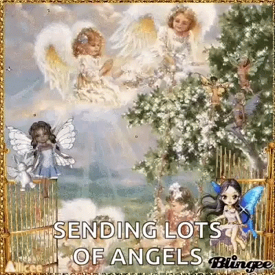 Animated scene featuring cute angels, with the message 'Sending Lots of Angels' displayed.