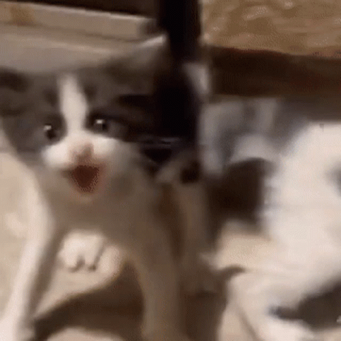 A small gray and white kitten displays fierce anger, hissing and making an 'uuuugh' sound with its mouth open.