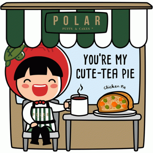 Angkukuehgirl enjoying a chicken pie and tea at a Polar Puffs & Cakes storefront, with a cute message.