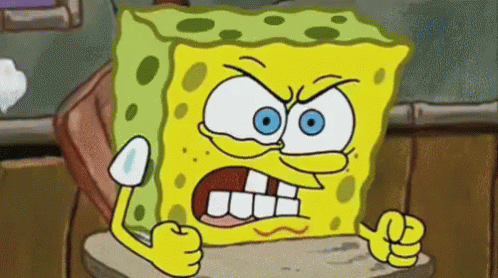A cartoon of Spongebob Squarepants with an angry face, conveying frustration or annoyance.