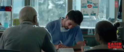 Shahid Kapoor as Kabir Singh, angry and annoyed, talking to patients in a doctor's office.