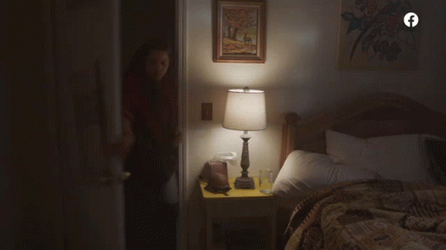 Callie Thomas enters a dimly lit bedroom, looking angry, and sits on the bed next to a lamp.