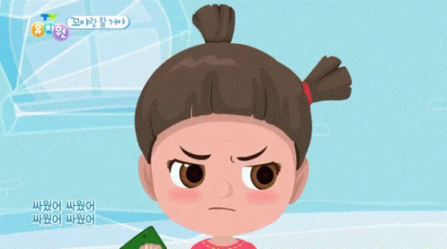 Kkoya, the cartoon girl from Tv Kindergarten, looks angry with a red face, holding a phone.