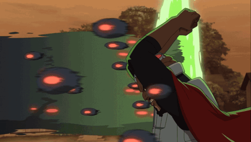 a man in a red cape holds up his fist in front of a green background