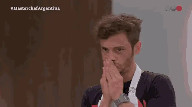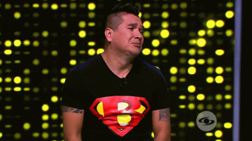Colombian comedian Boyacoman looks distressed and sad, wearing a Superman shirt on a brightly lit stage.