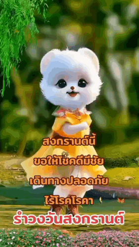 a white teddy bear is wearing a yellow dress and standing in a field of flowers .