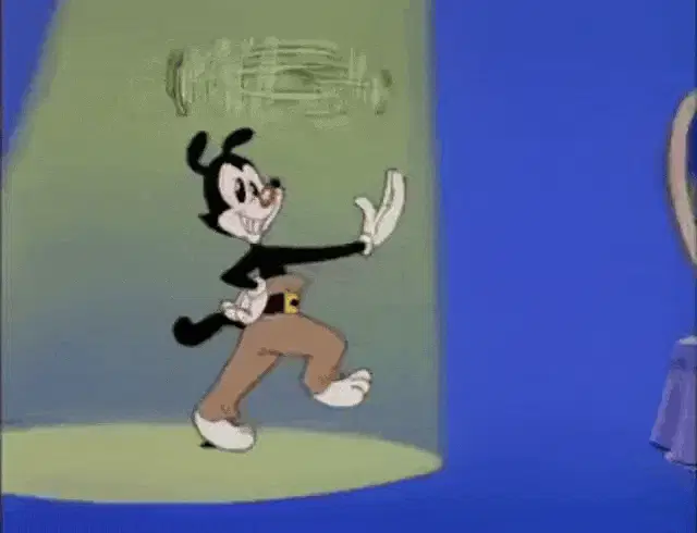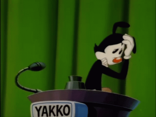Yakko from Animaniacs stands at a podium labeled 'YAKKO', appearing to be thinking or struggling to remember something.