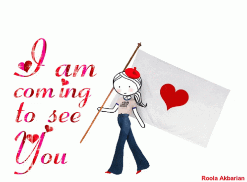 An animated greeting card featuring a stick figure girl holding a flag with a heart, text reads 'I am coming to see You'.