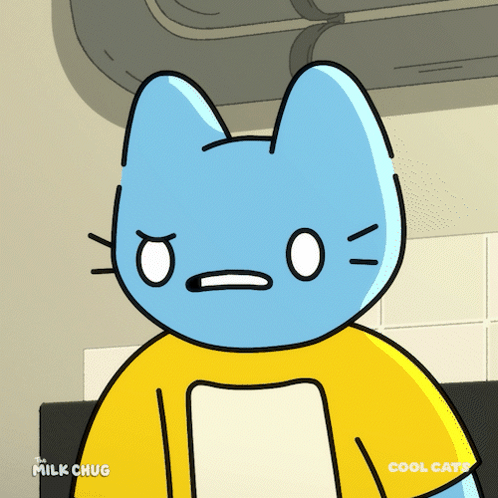 Blue cat character from 'Cool Cats' cartoon looks confused and shrugs, wearing a yellow shirt.