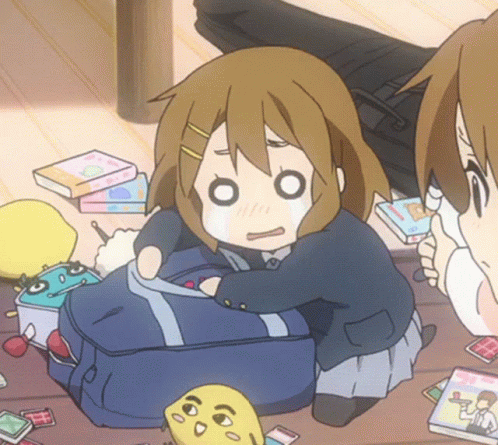 Anime girl in school uniform panicking and crying while searching through her blue duffel bag on the floor.