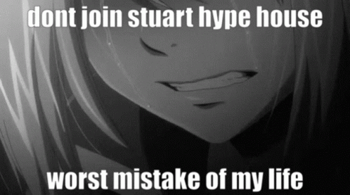 An anime character crying with the text 'dont join stuart hype house worst mistake of my life' displayed.