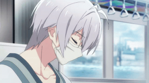 Idolish7 characters on a train, one sleepy with a mask, hands gently held.
