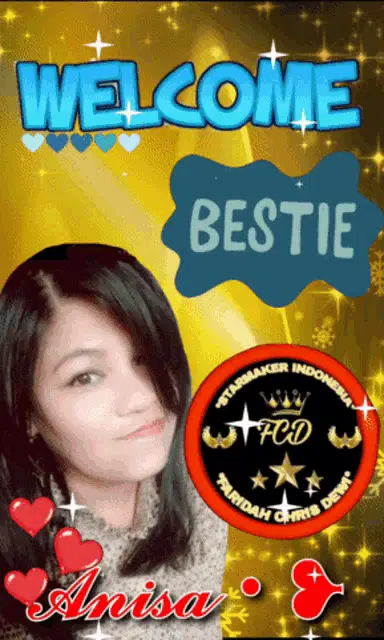 Anis wearing a blue hijab, making a finger heart gesture, with a 'Love' overlay on her face.