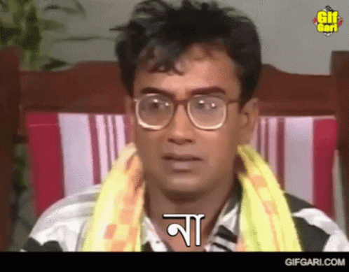 Anis (Zahid Hasan) from Aaj Robibar reacting with 'No' (না), wearing glasses and a yellow scarf.