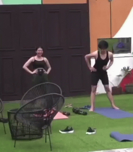 Anji Salvacion and KD Estrada performing side stretches on yoga mats in a green outdoor area.