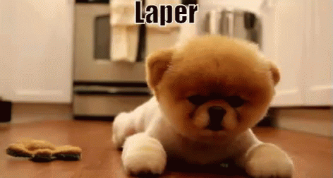 A cute fluffy dog looking hungry while lying on the floor next to a biscuit.