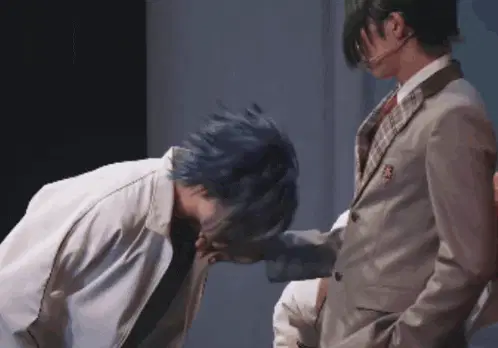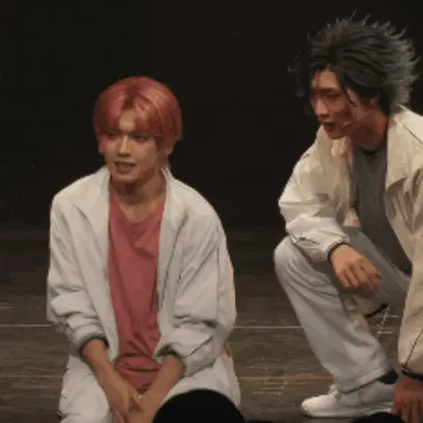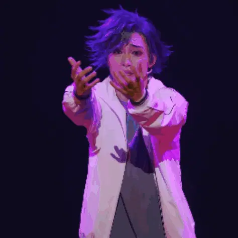 Natsume Sakasaki from Ensemble Stars poses with the 'Anjing Lo' text overlay in a vibrant stage performance.