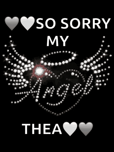 A graphic with white hearts, sparkling wings, and the text 'SO SORRY MY Angel THEA' on a black background.