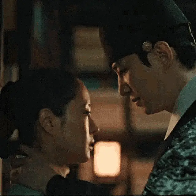 Lee Junho, dressed in traditional Korean attire, covers his mouth then laughs joyfully in a scene from Annedramas.