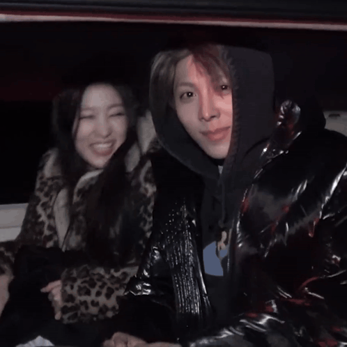 a man and a woman sitting in a car waving their hands