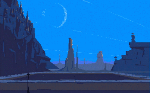 A pixel art cinematic from the classic game Another World, featuring a man emerging from water in an alien landscape.