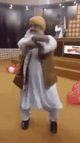 Ansab dancing energetically in a room decorated with red and white balloons.
