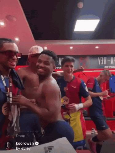 Ansu Fati and Barcelona teammates celebrate their Copa del Rey victory in the locker room with dancing and cheering.