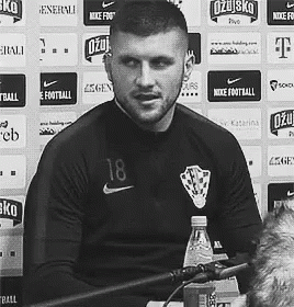 Ante Rebic, wearing a number 18 jersey, speaks at a press conference, likely during the World Cup.