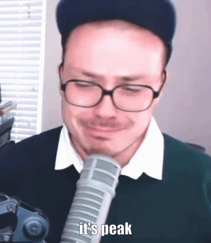 Anthony Fantano, Theneedledrop, crying into a microphone with the caption 'it's peak' visible.